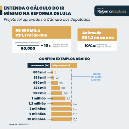• Acima de R$ 1,2 milhão/ano: alíquota do imposto mínimo fixada em 10%.
