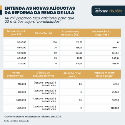 • A estimativa do governo é que 20 milhões de brasileiros deixem de pagar IR com essa isenção; desses, 10 milhões já eram isentos antes da reforma.